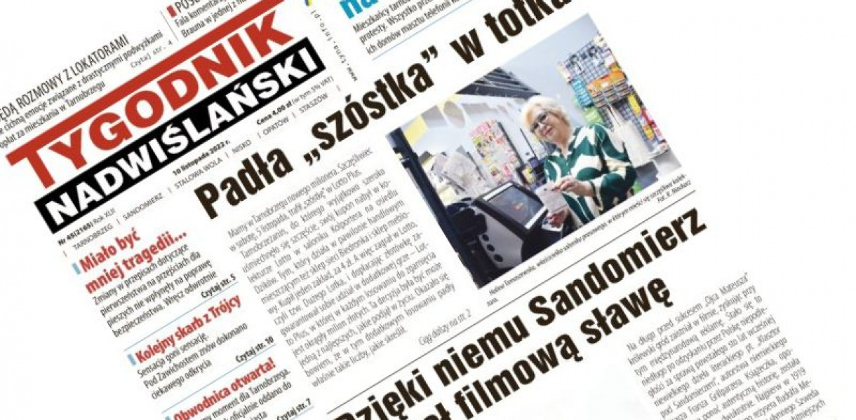 Od 10 listopada w sprzedaży jest nowy numer Tygodnika Nadwiślańskiego (nr. 45/2022). Na jego pierwszej stronie znajdziecie zajawki testów o pierwszej od 10 lat dużej wygranej w Lotto w Tarnobrzegu, a także o filmie, za sprawą którego Sandomierz zyskał międzynarodową reklamę - na długo przed sukcesem "Ojca Mateusza".