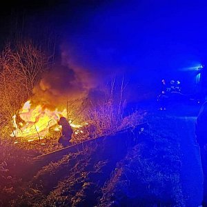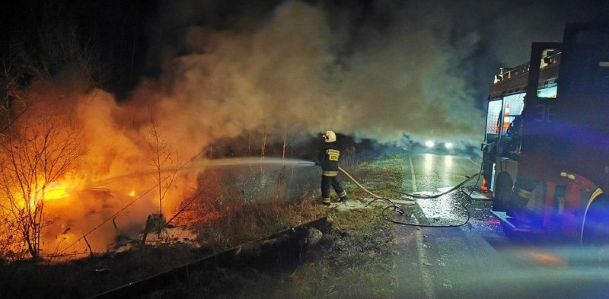 Dziś w nocy w Grębowie doszło zdarzenia drogowego, w którym samochód osobowy uderzył w słup i dachował. Pojazd stanął w ogniu.