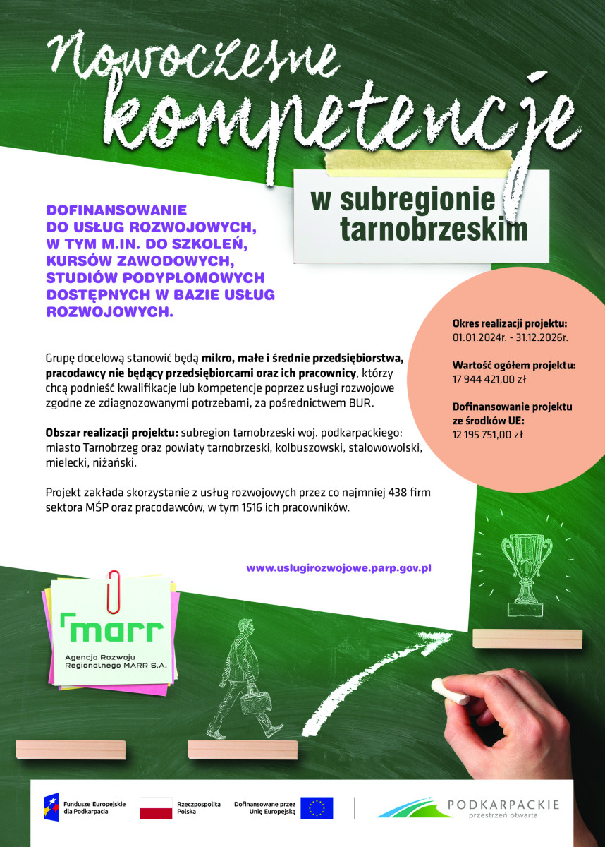 Projekt pt. „Nowoczesne kompetencje w subregionie tarnobrzeskim” realizowany jest przez Agencję Rozwoju Regionalnego MARR S.A. na podstawie umowy nr FEPK.07.09-IP.01-0013/23-00 z dnia 02.11.2023 r. zawartej z Województwem Podkarpackim – Wojewódzkim Urzędem Pracy w Rzeszowie.