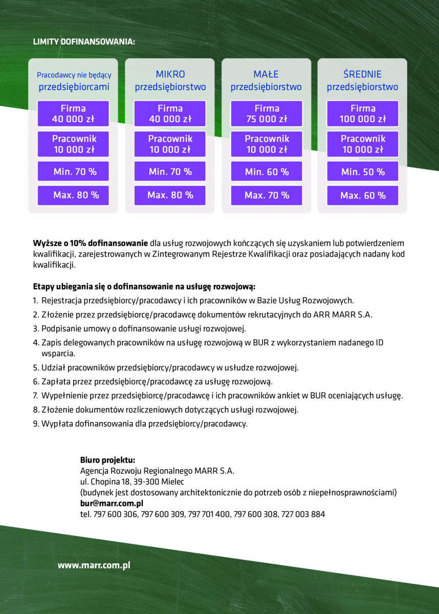 Agencja Rozwoju Regionalnego „MARR S.A.” informuje, że w rozpoczyna się 11 tura naboru przedsiębiorców do projektu „Nowoczesne kompetencje w subregionie tarnobrzeskim”. W ramach projektu udzielane jest dofinansowanie do organizacji kursów, szkoleń i studiów podyplomowych w firmach dla przedsiębiorców z powiatów: tarnobrzeskiego, mieleckiego, stalowowolskiego, niżańskiego i kolbuszowskiego.