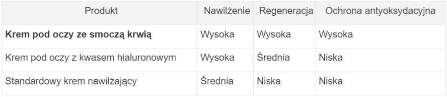 Porównując krem pod oczy ze smoczą krwią z innymi produktami dostępnymi na rynku, jego wyjątkowość i skuteczność stają się jeszcze bardziej widoczne. Na przykład, w porównaniu z kremami zawierającymi wyłącznie kwas hialuronowy, krem ze smoczą krwią wykazuje nie tylko działanie nawilżające, ale również regenerujące i ochronne dzięki swoim unikalnym składnikom. Poniższa tabela przedstawia porównanie właściwości kremu ze smoczą krwią do popularnych kremów pod oczy: