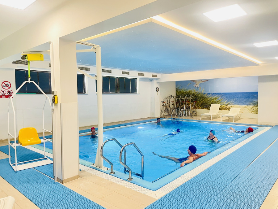 Ośrodek posiada bogatą infrastrukturę wellness, która stanowi integralny element procesu rehabilitacji. Pacjenci mają do dyspozycji basen z windą ułatwiającą dostęp osobom z ograniczoną mobilnością, saunę wspierającą krążenie i redukcję napięcia mięśniowego, salę cardio oraz zielony taras idealny do relaksu na świeżym powietrzu.
