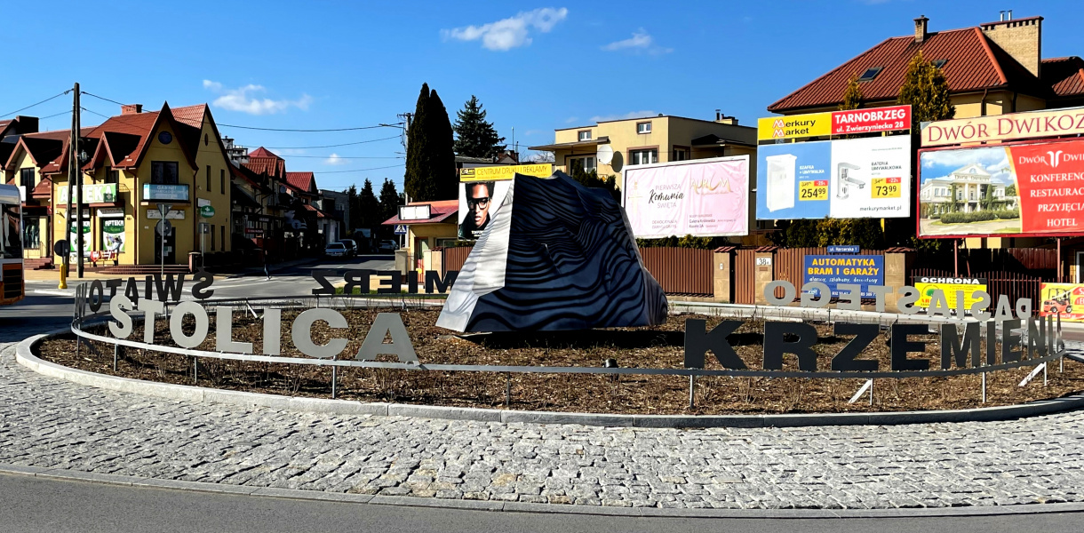 Aranżacja na rondzie Optymizmu zyskała brakujący element. We wtorek, 12 kwietnia zamontowano tam napis przypominający o tym, że Sandomierz jest światową stolicą krzemienia pasiastego.