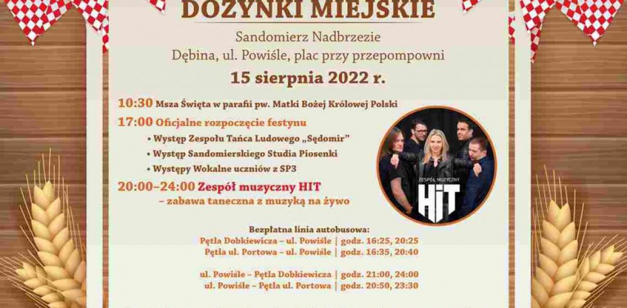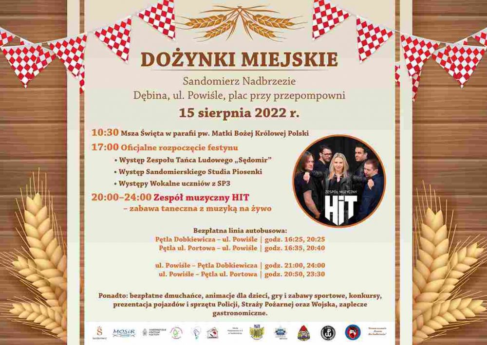 Dożynki rozpocznie o 10.30 msza święta w kościele pod wezwaniem Matki Bożej Królowej Polski. Początek festynu na placu przy ulicy Powiśle w Nadbrzeziu zaplanowany jest na 17. Na scenie wystąpią: Zespół Tańca Ludowego ,,Sędomir", artyści z Sandomierskiego Studia Piosenki oraz uczniowie ze Szkoły Podstawowej numer 3.