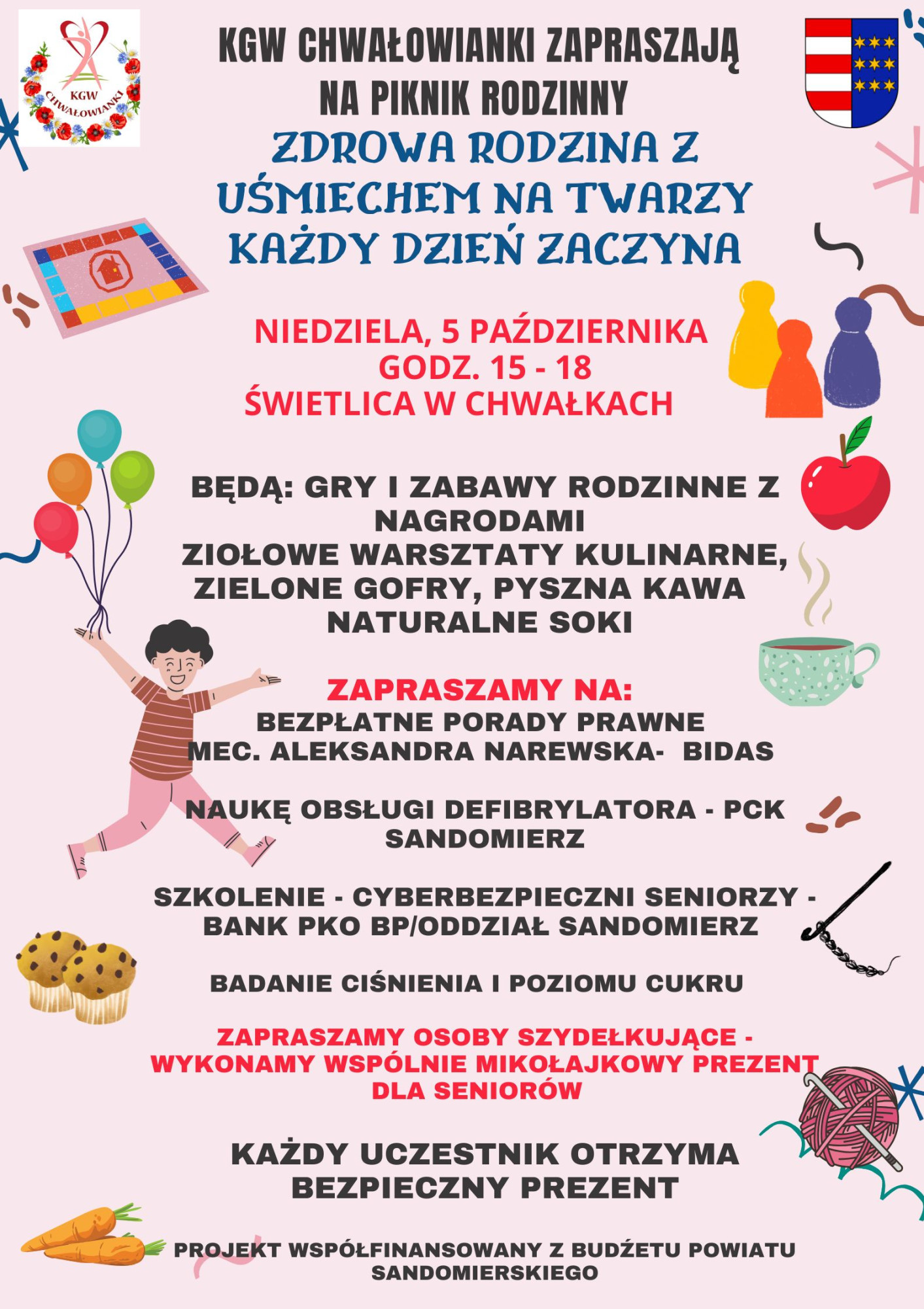 Piknik pod hasłem „Zdrowa rodzina z uśmiechem na twarzy każdy dzień zaczyna” skierowany jest do dzieci, młodzieży, rodzin i seniorów. W bogatym programie każdy znajdzie coś dla siebie. Dla najmłodszych przygotowano gry i zabawy. Będzie przeciąganie liny, zabawy z chustą i gra w kręgle. Będzie można zagrać w planszówki.