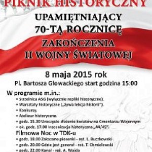 Na "żywą lekcję historii", inscenizację historyczną "44/45", strzelnicę oraz konkursy zaprasza prezydent Tarnobrzega 8 maja od godz. 15 na pl. B. Głowackiego. Impreza ma upamiętnić 70. rocznicę zakończenia II wojny światowej. Z tej okazji o godz. 15.30 na cmentarzu wojennym złożone zostaną kwiaty. Od godz. 18 do 22 w Tarnobrzeskim Domu Kultury potrwa "noc filmowa". Wyświetlone zostaną "Zakazane piosenki", "Gdzie jest generał" i "Kanał". (wp)