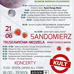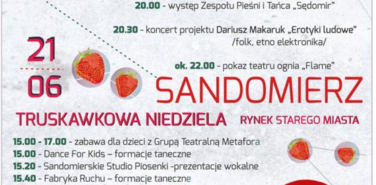 Atrakcyjny weekend w Sandomierzu. W sobotę noc świętojańska na bulwarze Piłsudskiego, a dzień później "Truskawkowa niedziela" na Rynku. Sobotnią zabawę rozpocznie jubileuszowy koncert Sandomierskiej Orkiestry Dętej z okazji 10-lecia jej powstania na Rynku Starego Miasta. Później na bulwarze (godz. 18) inscenizacja Szkolnej Grupy Teatralnej "Muza", a po niej konkurs na najpiękniejszy wianek. O godz. 19 wystąpi Zespół Pieśni i Tańca "Ziemia Sandomierska", a o 20 ZPiT "Sędomir". Sobotę zakończy pokaz Teatru Ognia "Flame". W niedzielę od godz. 15 prezentować się będą na Rynku sandomierskie formacje taneczne i wokaliści Studia Piosenki. Od godz. 17 blok koncertowy. Najpierw wystąpi zespół "Sando all stars", potem "s.n.o.w", a o 19.30 gwiazda wieczoru - "Kult". Organizatorem imprez jest Sandomierskie Centrum Kultury i MOSiR. (wp)