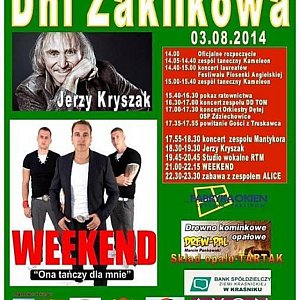 W najbliższą niedzielę 3 sierpnia w Zaklikowie, na stadionie tutejszej "Sanny", odbędą się kolejne jednodniowe "Dni Zaklikowa". Impreza rozpoczyna się po godz. 14 występem zespołu tanecznego "Kameleon" oraz koncertem laureatów Festiwalu Piosenki Angielskiej. Na godz. 15.40 zaplanowano pokaz ratownictwa, na 16.30 - koncert zespołu DD "Tom", a na godz. 17 - koncert Orkiestry Dętej OSP Zdziechowice. Pół godziny później Zaklików powita gości z Truskawca, a tuż przed godz. 18 estradę weźmie we władanie zespół "Mantykora", po którym wystąpi Jerzy Kryszak. W wieczorną część programu uczestników zabawy wprowadzi o godz. 19.45 Studio Wokalne RTM, o godz. 21 estradą i gośćmi "Dni" zawładnie "Weekend", po którym pozostanie już tylko startująca o godz. 22.30zabawa z zespołem "Alice". Nie zabraknie dobrej gastronomii, napitków wszelakich, konkursów i innych rozrywek. Wstęp, naturalnie, wolny. (r)
