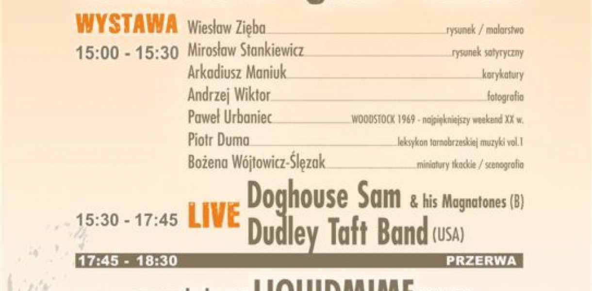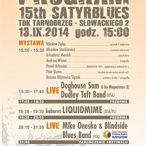 Zainauguruje ją wernisaż rysunku, fotografii, a nawet miniatur tkackich aż sześciu artystów oraz promocja "Leksykonu tarnobrzeskiej muzyki" Piotra Dumy. Później uczta muzyczna dla fanów bluesa (a zjeżdżają na tę imprezę z całego świata!). Wystąpią "Doghouse Sam and his Magnatones", "Dudley Taft Band", kabaret "Liquidmime" o proweniencji polsko-amerykańskiej, oraz Mike Onesko & "Blindside Blues Band". Godzin wernisażu i koncertów nie podajemy, ponieważ od dawna nie ma już biletów na tę imprezę. Miłośnikom bluesa pozostaje jedynie bezpośrednia transmisja Radia Rzeszów z koncertów o godz. 15.30 i 20.10.Wszyscy natomiast od 14 września do połowy października będą mogli obejrzeć "satyrbluesowe" wystawy: Wiesława Zięby (rysunek/malarstwo), Mirosława Stankiewicza (rysunek satyryczny), Arkadiusza Maniuka (karykatury), Andrzeja Wiktora (fotografia), Pawła Urbańca(Woodstock 1969 - najpiękniejszy weekend XX w.) oraz tarnobrzeżanki Bożeny Wójtowicz-Ślęzak (miniatury tkackie/scenografia). (wp)