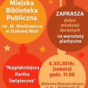 Miejska Biblioteka Publiczna w Stalowej Woli zaprasza wszystkich w najbliższą sobotę, 6 grudnia, o godz. 11 do budynku Biblioteki Międzyuczelnianej przy ul. Popiełuszki 10. W tym terminie odbędą się - adresowane do wszystkich, pragnących wysłać bliskim jedyną i niepowtarzalną kartkę z życzeniami - warsztaty kreatywnego tworzenia kartek świątecznych. (r)