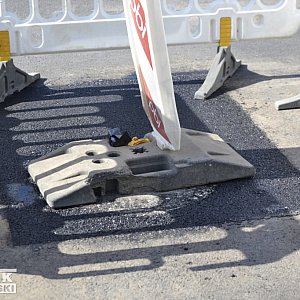 Wycięcie dziury w użytkowanej już drodze sprawiło, że kierowcy jadący od ulicy Kwiatkowskiego w kierunku obwodnicy musieli omijać postawioną blokadę drogową lewym pasem jezdni. A gdy już blokadę zdjęto okazało się, że wokół studzienki powstała asfaltowa łata. A jakby tego było mało... asfaltem zalano też pokrywę studzienki.