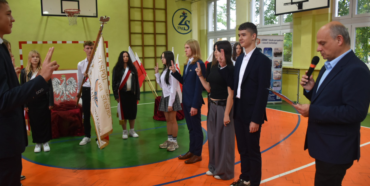 Nie zabrakło również zwrotu do uczniów, zwłaszcza tych, którzy dopiero rozpoczęli naukę w „Górniku”. W piątek pierwszoklasiści złożyli uroczyste ślubowanie, stając się pełnoprawnymi członkami szkolnej społeczności. – Dzisiejszy dzień to okazja, by spojrzeć z wdzięcznością na swoich nauczycieli – to oni pomagają Wam odkrywać świat, rozwijać talenty i przekraczać własne ograniczenia. Pamiętajcie, że nauka to inwestycja, która zawsze się opłaca – mówił dyrektor.