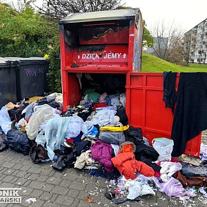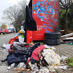 Podrzucone śmieci, w tym tzw. „wielkogabartyty” zostały podpalone w piątek, 14 listopada, w godzinach popołudniowych. Pożar ugasili strażacy. Od tamtego momentu tekstylia, które wysypały się z uszkodzonego kontenera, ale też zostały podrzucone obok niego, leżą na chodniku.