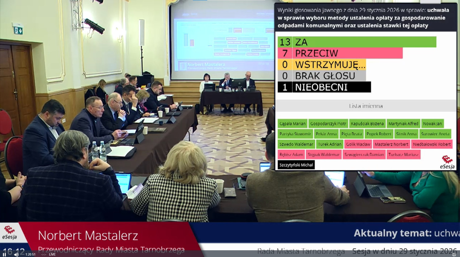 Przeciwko głosowało 7 radnych z klubu Koalicji Obywatelskiej i większość klubu Razem dla Tarnobrzega (Wacław Golik, Norbert Mastalerz, Robert Niedbałowski, Adam Rębisz, Waldemar Stępak, Damian Szwagierczak i Mariusz Turbacz).