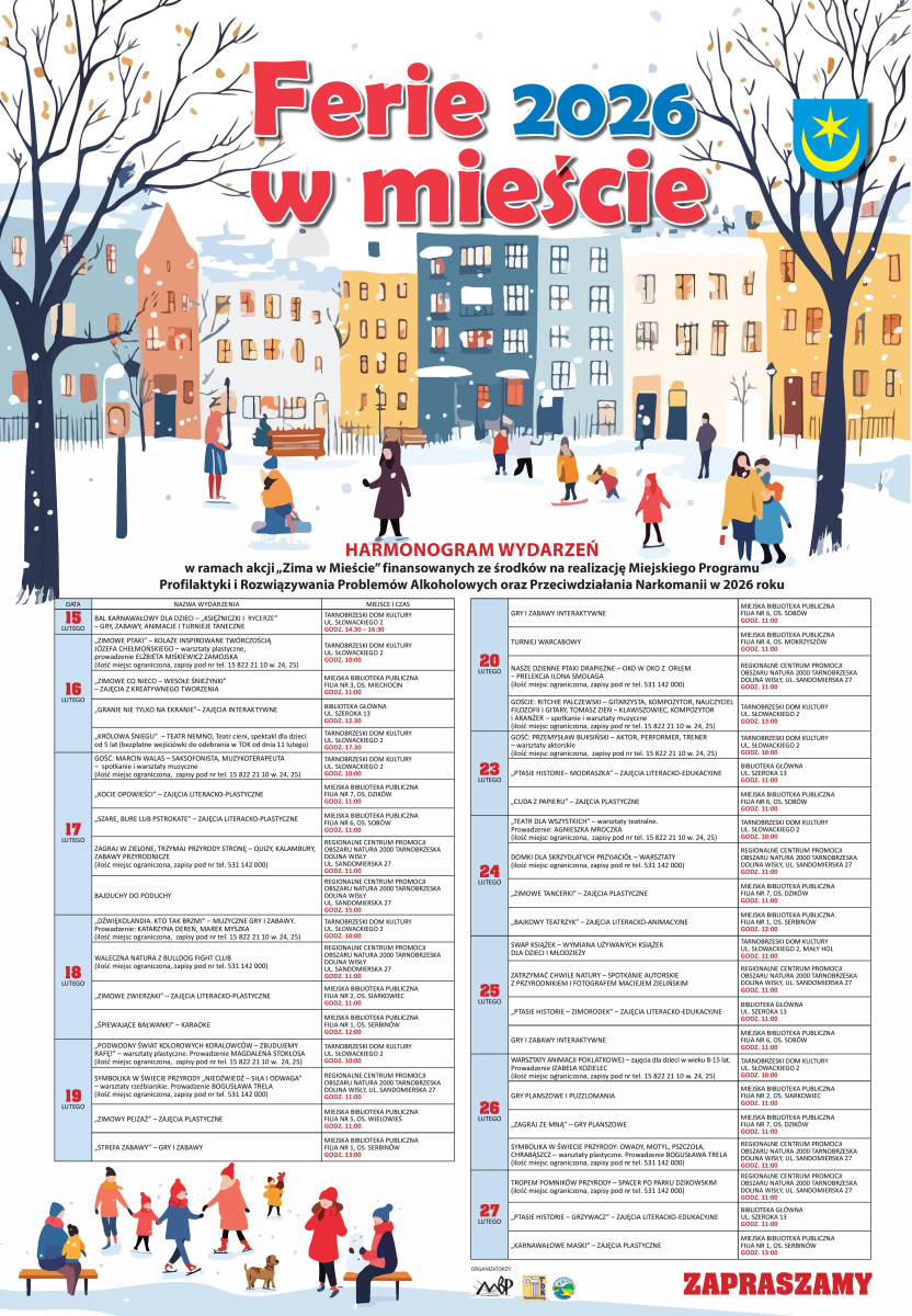 Zajęcia będą odbywać się od połowy do końca lutego w kilku lokalizacjach: Tarnobrzeskim Domu Kultury, Miejskiej Bibliotece Publicznej – zarówno w siedzibie głównej, jak i w filiach na osiedlach – oraz w Regionalnym Centrum Promocji Obszaru Natura 2000. Dzięki temu dzieci z różnych części miasta będą miały łatwy dostęp do przygotowanych atrakcji.