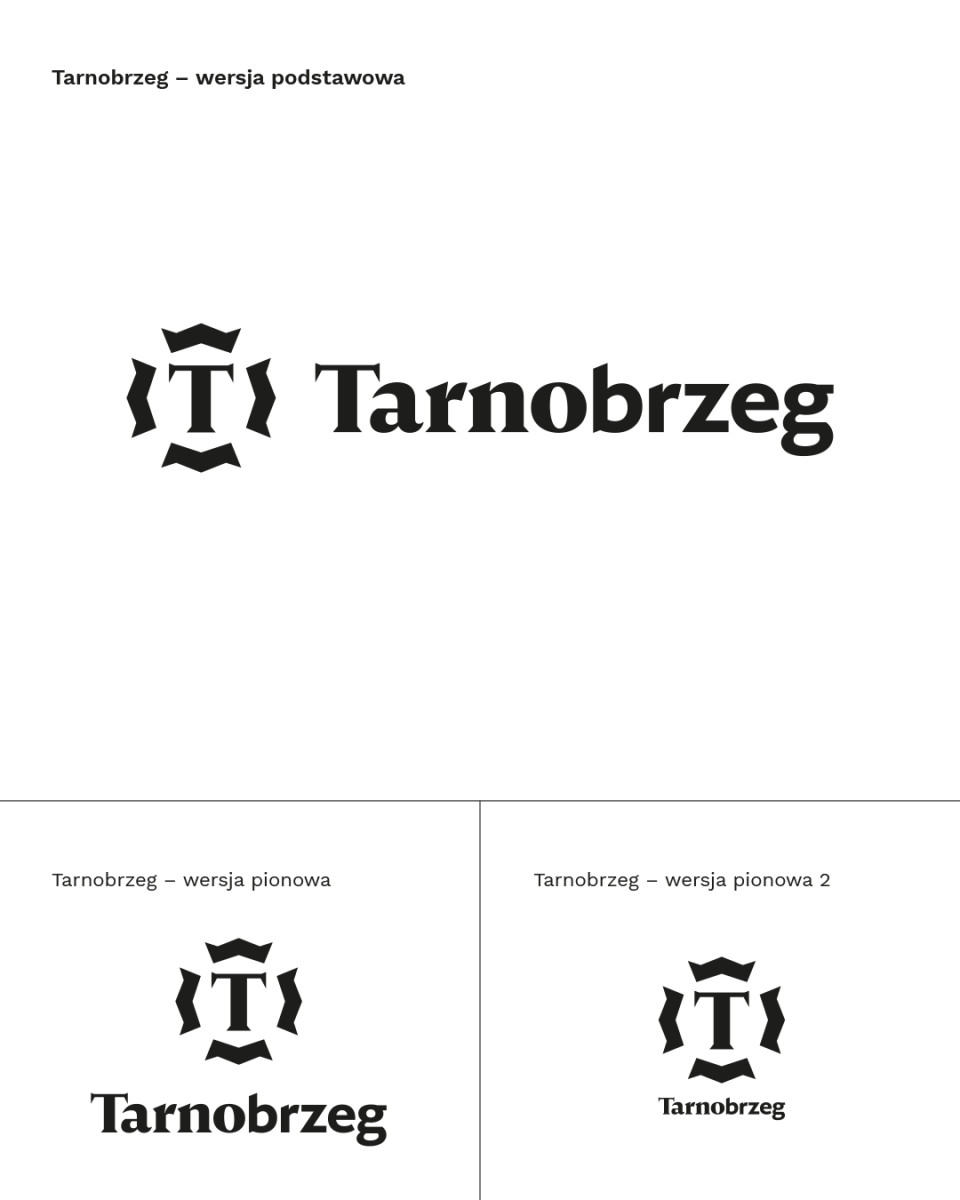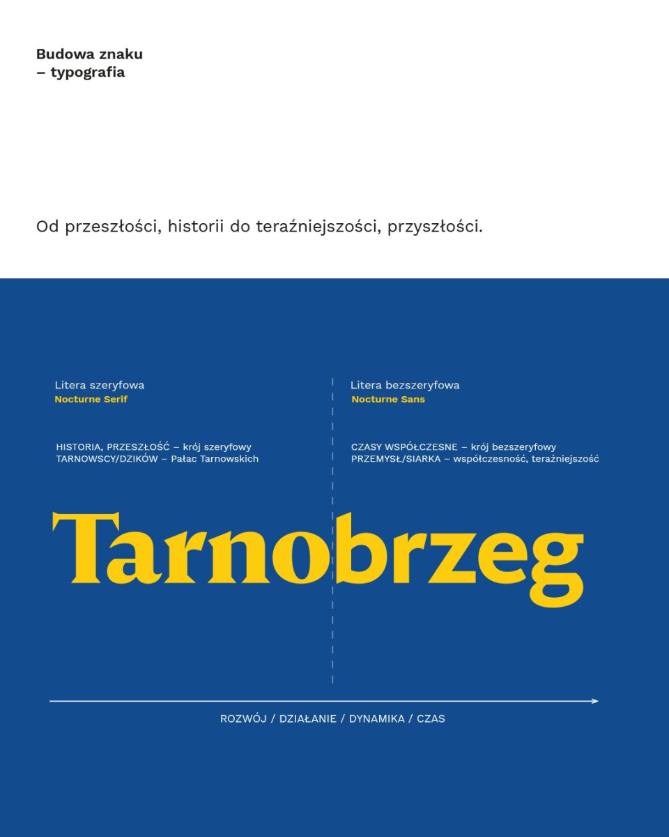 W typografii kontynuowaliśmy ideę „od przeszłości i historii do teraźniejszości i przyszłości”. Zaproponowaliśmy zapis nazwy miasta z wykorzystaniem dwóch wersji kroju: „Tarno” – krojem szeryfowym, nawiązującym do historii i dziedzictwa miasta, „brzeg” – krojem bezszeryfowym, odnoszącym się do nowoczesności, przyszłości oraz brzegu Jeziora Tarnobrzeskiego, z którym obecnie miasto jest silnie kojarzone przez turystów. W ten sposób idea przejścia od przeszłości do przyszłości została przedstawiona symbolicznie również w typografii.