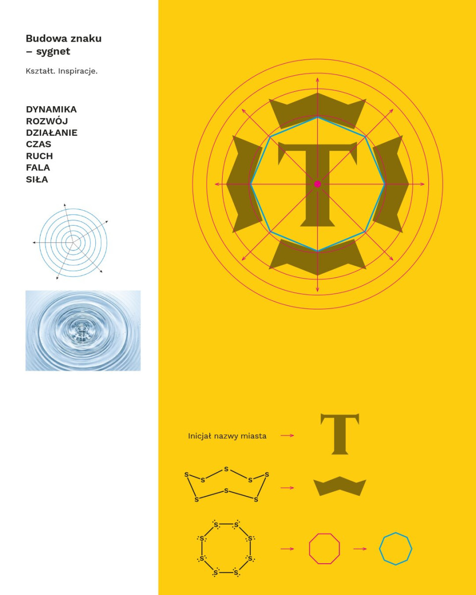 Punktem wyjścia do pracy nad sygnetem była budowa siarki. Na jej bazie opracowaliśmy mocną, wyrazistą i charakterystyczną formę graficzną. Kolejnym elementem kompozycji jest inicjał miasta – litera „T”. W projekcie wykorzystaliśmy polski krój szeryfowy Nocturne Serif. Jego ostre zakończenia (szeryfy) bardzo dobrze współgrają stylistycznie i formalnie z geometryczną formą inspirowaną budową siarki. Finalna forma sygnetu zawiera również odniesienia do wody i fali – Jeziora Tarnobrzeskiego oraz Wisły. Kręgi na wodzie są jednak czymś więcej niż tylko falą – to symbol energii, która rozchodzi się promieniście z jednego punktu do wielu miejsc, symbolizując rozwój, wpływ i oddziaływanie. Litera „T” stanowi centrum kompozycji – punkt początkowy, impuls, symboliczny początek historii miasta: 1593 r. – nadanie Tarnobrzegowi praw miejskich, historia rodu Tarnowskich, przeszłość miasta. Rozchodzące się promieniście formy inspirowane siarką symbolizują natomiast: 1953 r. – odkrycie złóż siarki, rozwój przemysłu siarkowego, współczesność, działanie, dynamikę i rozwój.