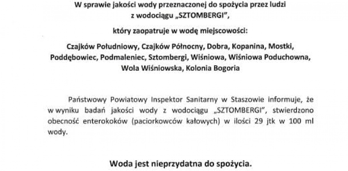Tym razem sanepid potwierdził wystąpienie skażenia, prawdopodobnie bakteriami paciorkowca kałowego, w wodociągu Sztombergi, który zaopatruje mieszkańców wiosek: Poddębowiec, Podmaleniec, Stara Dobra, Mostki, Sztombergi, Wiśniowa, Wiśniowa Poduchowna, Wola Wiśniowska, Czajków Północny, Czajków Południowy, Smerdyna.