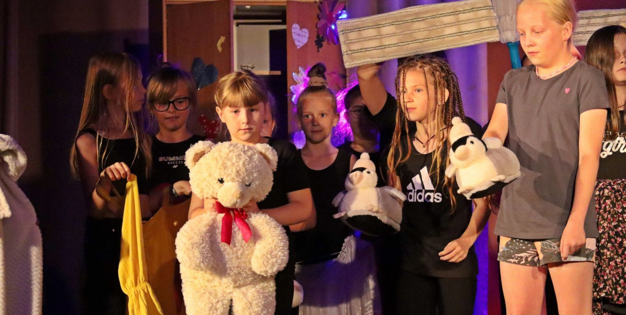 Przez 7 ciepłych lipcowych dni dzieci wiele się mogły nauczyć W ubiegły piątek zajęcia zakończono spektaklem zatytułowanym „Sekretne życie przedmiotów”. Skrzynie, suknie, koszule, miotły, mopy i spodnie ożyły. Spektakl został nagrodzony przez publiczność gromkimi brawami.