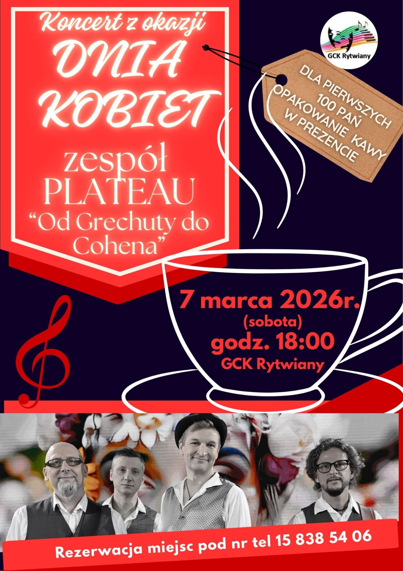 7 marca o godz. 18 w GCK z okazji Dnia Kobiet wystąpi zespół Plateau z projektem „Od Grechuty do Cohena”.