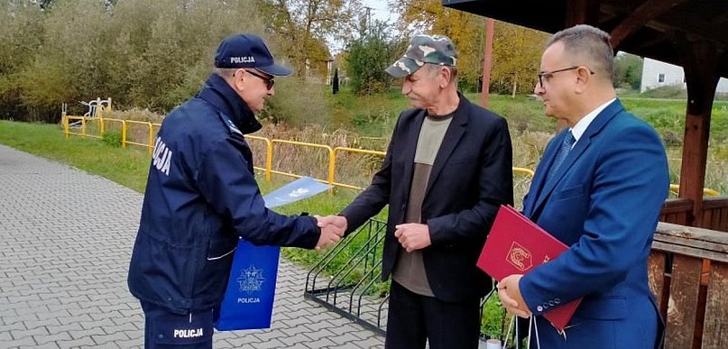Komendant powiatowy policji w Opatowie, mł. insp. Wojciech Szymczak wspólnie z burmistrzem Iwanisk Markiem Stańkiem przekazali podziękowania na ręce mieszkańca wioski Łopatno, Kazimierza Krakowiaka, za pomoc w odnalezieniu poszukiwanej przez cztery dni grzybiarki.