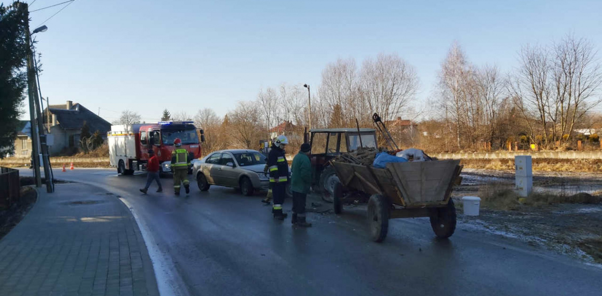 Ochotnicy po przybyciu na miejsce wypadku potwierdzili zgłoszenie o kolizji auta z ciągnikiem. Zadaniem strażaków było zneutralizowanie wycieków. Z ustaleń policji wynika, że 23-letni kierowca forda mondeo jadąc przez miejscowość Skopanie, nie dostosował prędkości do panujących warunków i doprowadził do zderzenia z ciągnikiem rolniczym. Sprawca kolizji został ukarany mandatem karnym w wysokości 1050 zł. Na szczęście, w wyniku zdarzenia nikt nie ucierpiał. Fot. Tarnobrzeg - 112 Ratownictwo Powiatu Tarnobrzeskiego