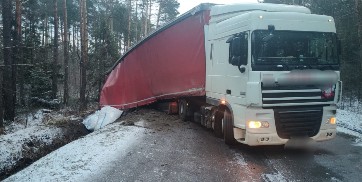 Jak wynika z ustaleń kierujący samochodem ciężarowym, stracił panowanie nad pojazdem, wpadł w poślizg na łuku drogi, w wyniku czego ciągnik siodłowy utknął w rowie, a naczepa zablokowała obydwa pasy ruchu.