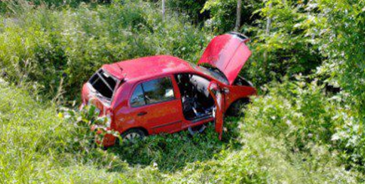 W wyniku uderzenia samochód osobowy zjechał z drogi i wpadł do rowu.
