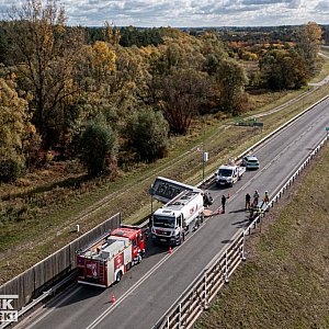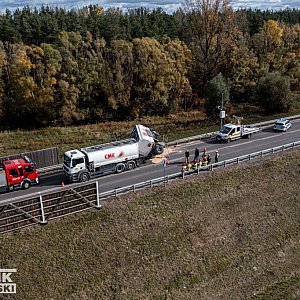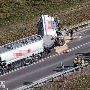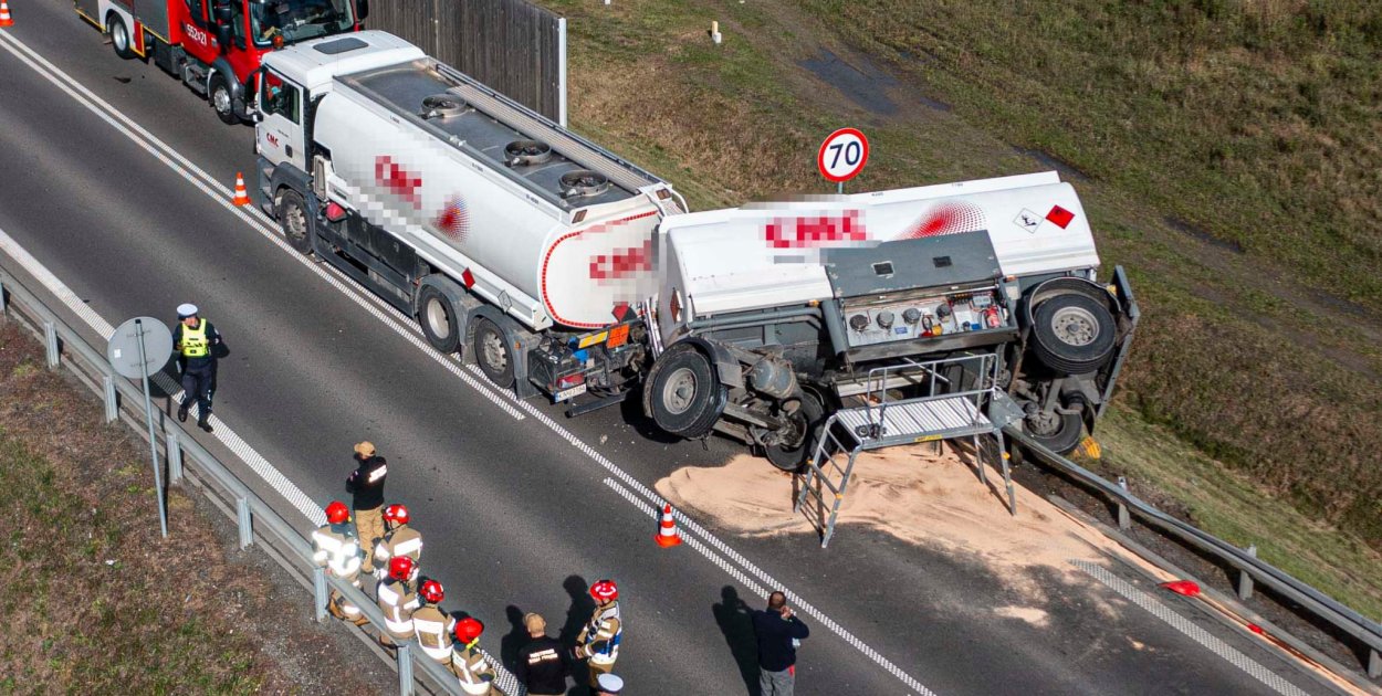 Ze wstępnych ustaleń wynika, że podczas gwałtownego hamowania zestawu ciężarowego, jedna z przyczep z cysterną wypełnioną paliwem przewróciła się na bok.