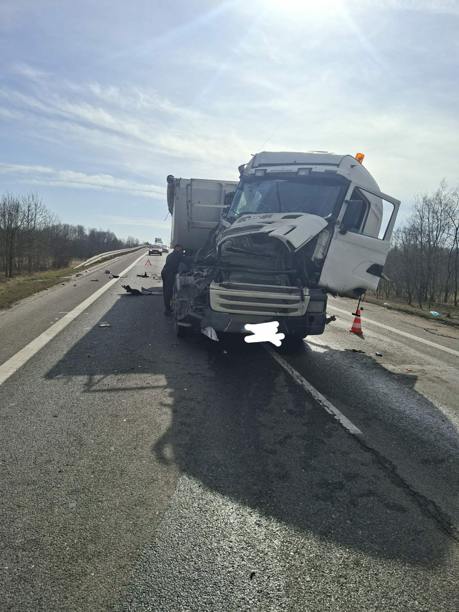We wtorek, 10 marca, na drodze krajowej nr 9 w Nowej Dębie doszło do zderzenia dwóch samochodów ciężarowych. Fot. KMP Tarnobrzeg