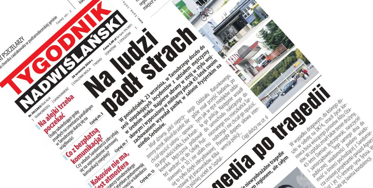 Od 26 września w sprzedaży jest nowe wydanie "Tygodnika Nadwiślańskiego" (nr 39/2024). Na pierwszej stronie piszemy o tym, w poniedziałek, 23 września, w mieście doszło do niepokojących incydentów z udziałem mężczyzny w średnim wieku. Ubrany w strój w stylu wojskowym i wyposażony w militarny plecak 45-latek swoim zachowaniem wywołał panikę w salonie fryzjerskim na osiedlu Serbinów. Mężczyzna próbował też wedrzeć się do Szkoły Podstawowej nr 10. Kilka godzin później uciekł ze Szpitalnego Oddziału Ratunkowego, gdzie miał przejść badania, po tym jak w ręce medyków oddała go policja. Następnie wsiadł do samochodu należącego do nieznanego mu mieszkańca Tarnobrzega i nie chciał go opuścić.