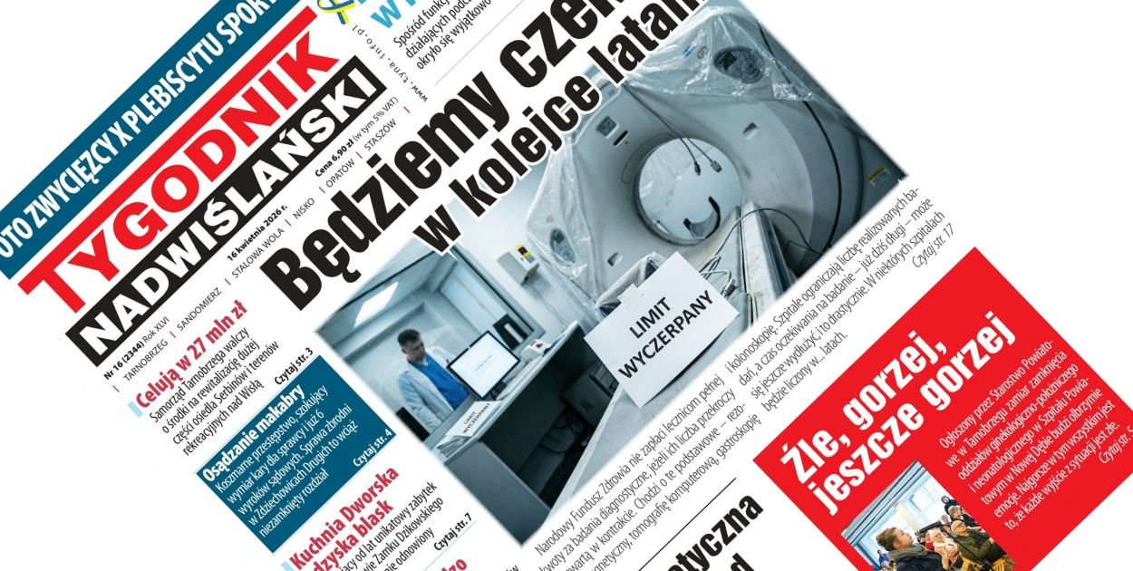 Od 16 kwietnia w sprzedaży jest nowe wydanie "Tygodnika Nadwiślańskiego" (nr 16/2026). Na pierwszej stronie piszemy o tym, że Narodowy Fundusz Zdrowia nie zapłaci lecznicom pełnej kwoty za badania diagnostyczne, jeżeli ich ilość przekroczy tą zawartą w kontrakcie. Chodzi o te podstawowe – rezonans magnetyczny, tomografię komputerową, gastroskopię i kolonoskopię. Szpitale ograniczają ilość realizowanych badań, a czas oczekiwania na badanie już dziś długi, może się jeszcze wydłużyć i to drastycznie. W niektórych szpitalach będzie liczony w...latach. Znajdziecie również artykuł o tym, że w środę, 15 kwietnia, nad Jeziorem Tarnobrzeskim doszło do poważnego wypadku podczas nurkowania. Dzięki szybkiej i skoordynowanej akcji służb ratunkowych udało się przywrócić czynności życiowe jednej z poszkodowanych osób, 60-letniej kobiecie, którą po długiej reanimacji przewieziono do szpitala.