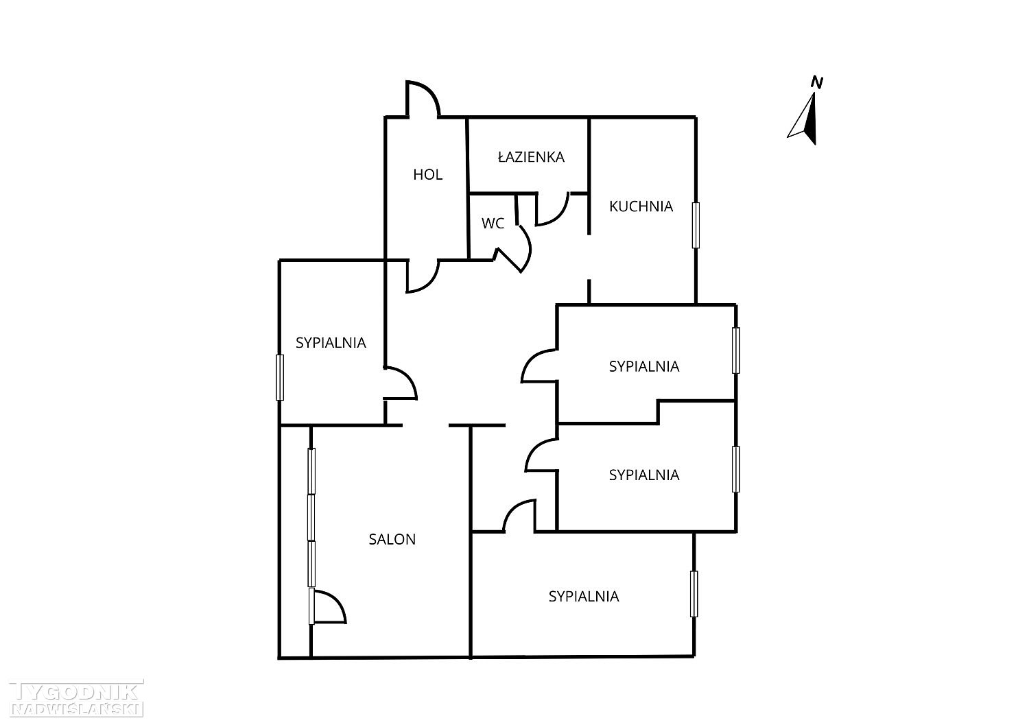 Mieszkanie ma 5 pokoi (salon i 4 sypialnie, wszystkie nieprzechodnie) oraz osobną kuchnię, łazienkę i toaletę, duży przedpokój oraz prywatny zamykany przedsionek (hol), w którym można bezpiecznie trzymać ubrania, buty, wózek lub rowery. Do mieszkania należy również schowek w piwnicy.