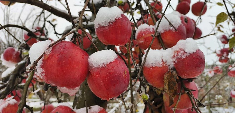 Dzisiejszy poranek przyniósł pierwsze w tym roku intensywne opady śniegu. Zimową szatę przybrały również podsandomierskie sady. Szczególne wrażenie robią te, w których gałęzie jabłoni wciąż uginają się pod ciężarem pozostawionych owoców.