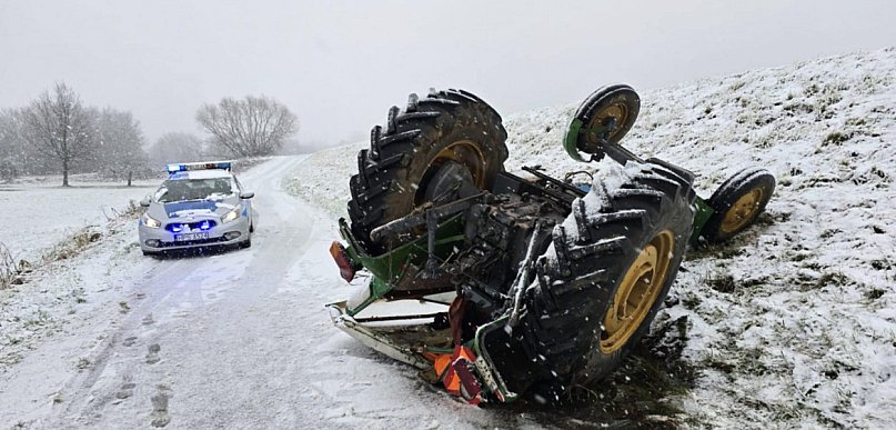 Ciągnik wpadł w poślizg i wyrócił się na drodze. Miał podpiętą przyczepę z drewnem